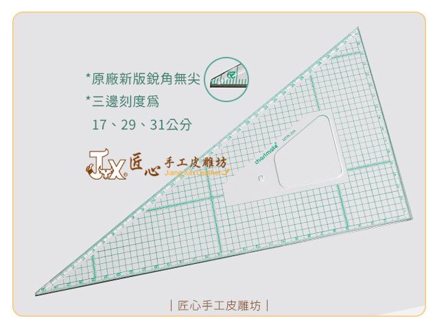 裁皮必備工具,邊緣(一邊)附有鐵條防護,可以輕鬆地進行切割,在也不必擔心刀刃將尺割壞,相當耐用。