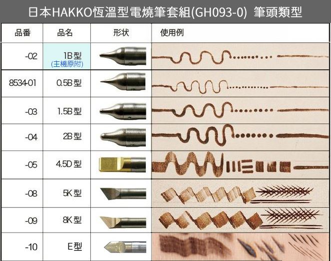 內容:HAKKO恆溫型電燒筆主機、筆頭更換器、 8種筆頭(主機原附的1B、0.5B、1.5B、2B、4.5D、5K、8K、E)